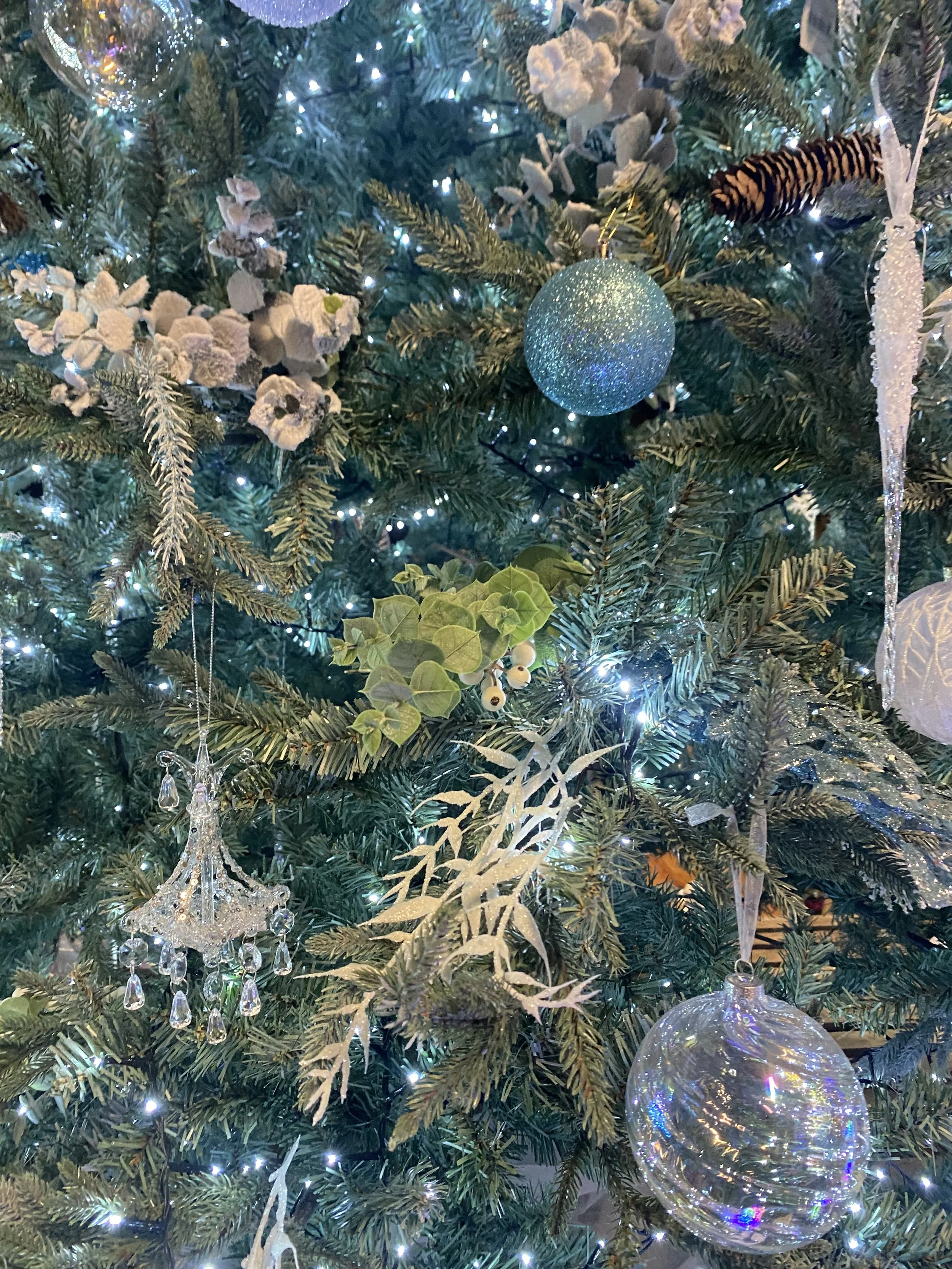 A breath taking collection of crystal glass baubles, delicate icicles and frosted aquamarine blue baubles and decorations.